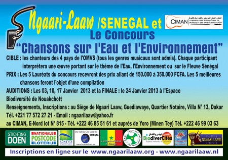 Article 1: Dans le cadre de la préservation du patrimoine culturel du fleuve Sénégal et l’intégration culturelle des peuples riverains du fleuve Sénégal Ngaari Laaw/ Sénégal , Doen / Pays-Bas et Ciman/Mauritanie organisent un concours musical réservé aux artistes chanteurs et aux autres résidents des 04 pays de l’OMVS (le Mali, le Senegal, la Mauritanie et la Guinee) Le concours concerne tous les genres et styles musicaux comprenant un texte sur l’Eau et l’Environnement s’appuyant sur une mélodie. Les play back ne sont pas acceptés.