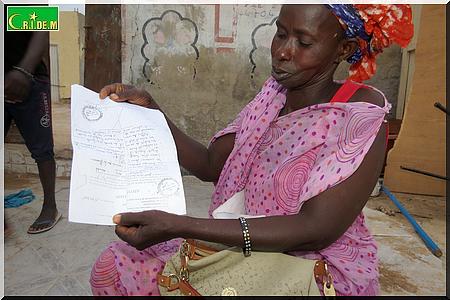 Mais, en bonne musulmane, Fatimata Ndiaye a encore la force d’y croire, qu’un jour son mari marcherait. Tout comme, elle espère récupérer son terrain situé au Secteur 6 Extension à Arafat. Fatimata Ndiaye explique qu’avec ses économies de vendeuse de poisson au marché du Ve arrondissement, elle avait réussi à s’acheter ce terrain.