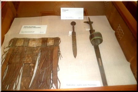 Des carquois, des flèches, un bonnet de guerrier, une pointe de lance, un poignard avec son fourreau, une têtière de cheval d’un cavalier d’Ahmadou et quelques manuscrits d’El Hadj Omar.
