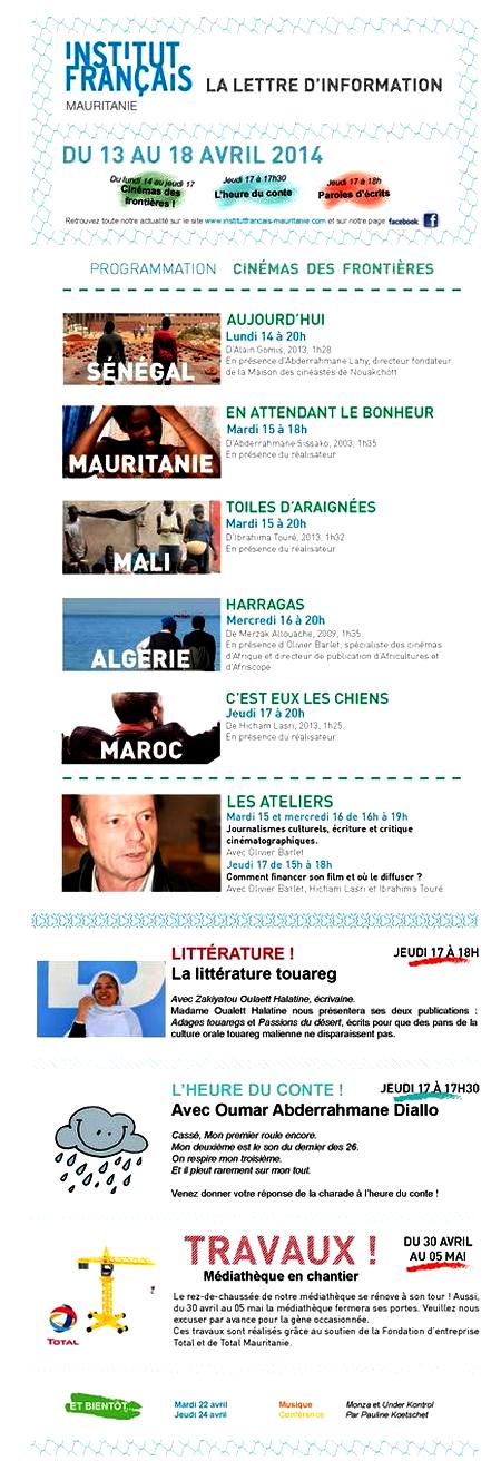 Du 14 au 17 avril 2014, venez découvrir Les cinémas des frontières, le nouveau rendez-vous cinématographique de l’Institut français de Mauritanie.
