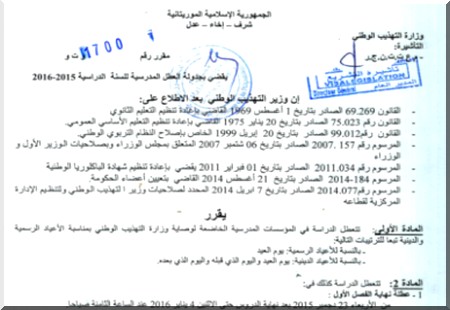 Atlasinfo - Le ministère de l'Education nationale a rendu public, une circulaire relative au calendrier des vacances arrêté pour l’actuelle année scolaire 2015-2016 et applicable à toutes les écoles et à tous établissements pédagogiques relevant du département sur toute l’étendue du territoire national.