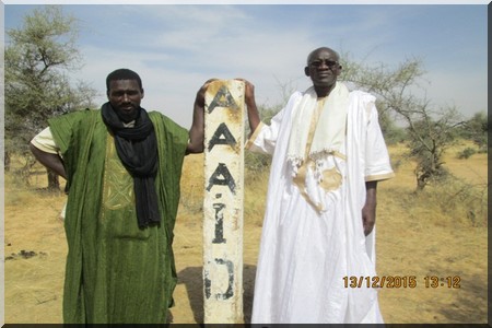 Arrêt sur l’une des bornes qui porte les initiales de l’AAAID en noir. Une photo du coordonnateur du ROSA et de notre guide prés de la borne. Nous visitons trois localités, Bour Walo et son puits construit en 1985, Diamel, Boubou Diénné, le marigot de Thiolgo qui inonde la cuvette de Karawlatt et le périmètre maraicher féminin de Bour réalisé avec le financement de Caritas.