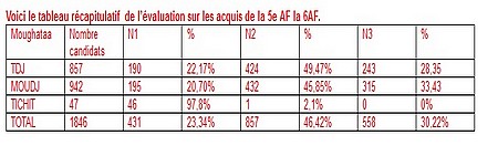 Voici le tableau récapitulatif de l’évaluation sur les acquis de la 5e AF la 6AF.