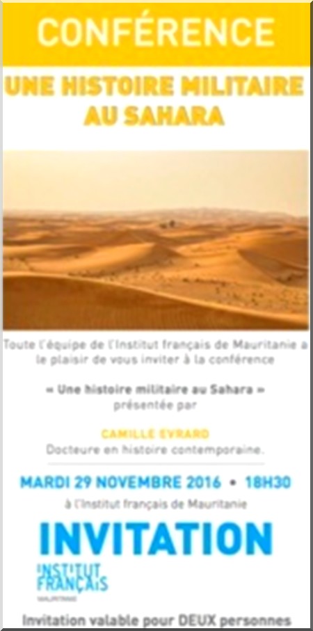 26-11-2016 01:00 - L’Institut français de Mauritanie a le plaisir de vous inviter à la conférence « Une histoire militaire au Sahara », le mardi 29 novembre à 18h30.