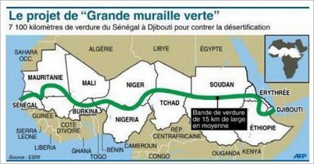 L’idée a été lancée en 2005 par l’ancien président nigérian Olusegun Obasanjo. Il s’agit de construire une grande barrière de végétation qui doit aller du Sénégal à Djibouti pour stopper l’avancée du désert du Sahara.