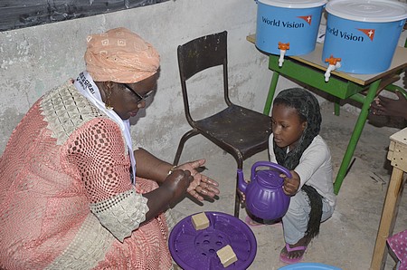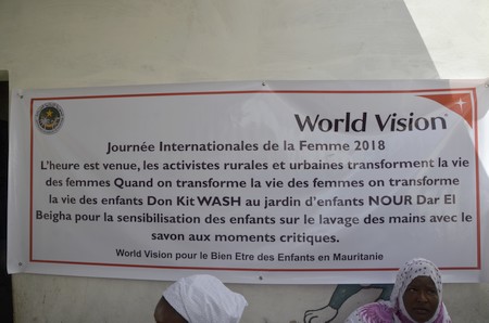 - Une visite par l'équipe féminine de World VIsion Mauritanie et un Don de Kit WASH a eu lieu au jardin d’enfants NOUR Dar El Beidha pour la sensibilisation des enfants sur le lavage des mains avec le savon aux moments critiques. Le Jardin d’enfant Nour que les femmes ont visiteé pour y apporter un don et sensibiliser les enfants sur le lavage des mains avec le savons compte 114 enfants au total y compris 50 enfants parrainés par World Vision.