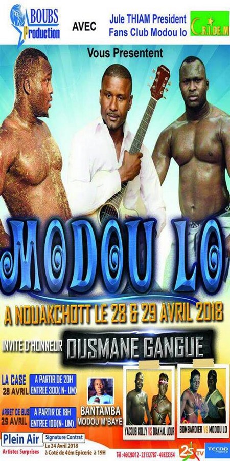 Il s’agit de la soirée d’Ousmane Gagngué, de retour à Nouakchott, face au célèbre lutteur sénégalais, Modou Lo. Le premier a marqué la musique mauritanienne, le second est une icône de la lutte sénégalaise avec frappe.