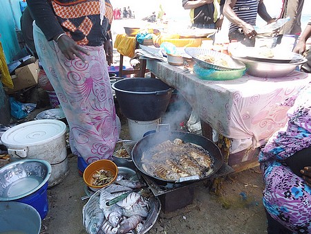 Policiers, gendarmes, garde-côtes, vendeurs à la criée, ménagères en quête d’économie, mareyeurs aux regards torves, enfants sur chariot ou vendant des emballages, côtoient des pêcheurs aux tuniques ruisselant, des porteurs empressés, un bac de poissons sur la tête, des piroguiers dévissant à l’ombre d’une poupe à sec, le tout au milieu d’une effervescence des jours de traite et le relent fétide des entrailles de poisson disséqués sur des tables pleines d’écailles et de sang.