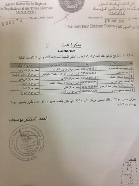 Alakhbar – L’ADG de l’Agence Nationale du Registre de la Population et des Titres Sécurisés (ANRPTS) Ahmed Moctar Bouceif a émis une note, tenue au secret des circuits des services de son organe, portant nomination d’un technicien au poste de Chef du centre des résidents à Nouadhibou.