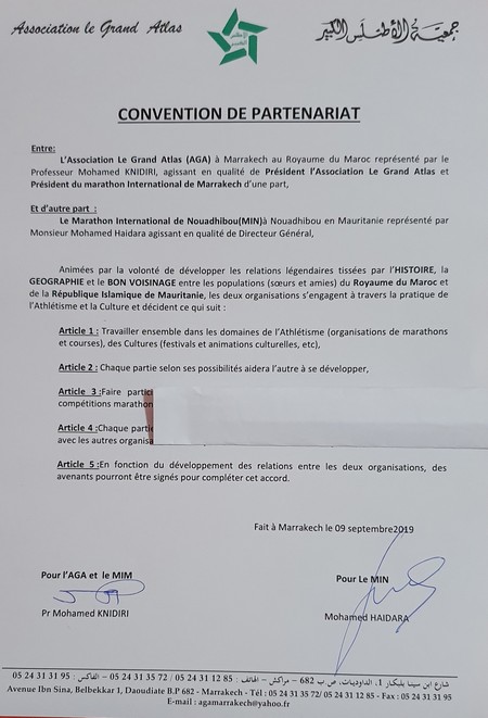 Durant toutes les formations, l'hôtel et les repas ont toujours été assurés gratuitement par le marathon International de Marrakech. Avec ce nouvel accord de partenariat, l’Association du Grand Atlas nous aidera à bénéficier de son expérience. Elle formera, s’il plait à ALLAH Le Tout Puissant, une trentaine de jeunes femmes et hommes dans les techniques et savoir-faire de festivals. Nous créerons au sein du marathon International de Nouadhibou une structure appelée : « Festival du Marathon de Nouadhibou » qui aura sa propre comptabilité et une gestion indépendante dans une rigueur et une transparence. Si vous regardez l'article 2 de la convention, il est clair que le Festival de Marrakech aidera le Festival du marathon International de Nouadhibou.
