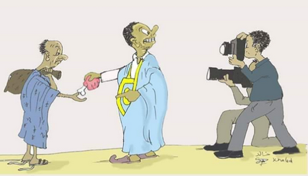 Sur une des caricatures « un homme avec large sourire, autosatisfaction béate, cameras au point, tends un morceau de viande a un pauvre… » Cette indécente « charité » qui consiste à soigner son image en faisant semblant d’aider les démunis est facilité par les selfies. Un bras pour donner le morceau de pain, l’autre, pour tirer la photo.