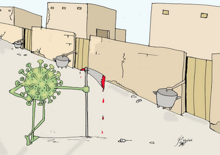 En ces temps de pandémies du COVID19, Khaled a pensé à ses personnages favoris : les humbles. Sur une caricature, « le virus, armé d’une hache ensanglantée, est seul sur une rue déserte. Des bras d’hommes tendent des marmites vide à travers les portes entrouvertes. » Il ressort de ce dessin toute la complexité du confinement en milieu pauvre ou les gens vivent au jour le jour. L’alternative est terrible : Sortit et chopper la maladie ou rester confiné et mourir de faim.
