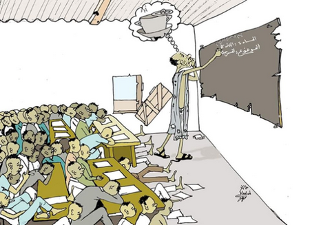 Autre thème récurrent dans les caricatures de Khaled : les gens humbles qui se battent pour joindre les deux bouts, pour faire face aux dépenses quotidiennes. « Un enseignant, dans une classe bondée, écrit au tableau en pensant marmite. » La marmite qu’il faut remplir chaque jour, qui hante le sommeil des économiquement faibles, est très présente dans les caricatures de Khaled. « Barmé hippetaaké » (on ne renverse pas la marmite) disent les peuls. Elle (la marmite) n’est renversée que quand il n’y a rien n’à manger.