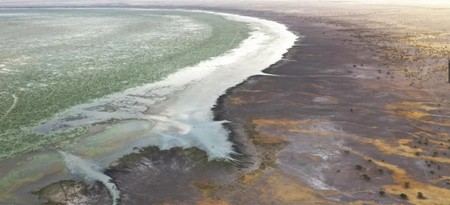 Une vue aérienne du lac Mahmouda en Mauritanie, montrant la décrue des eaux. © HCR/Colin Delfosse