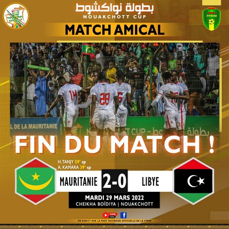Cridem Sports - La Mauritanie a dominé mardi 29 mars la Libye dans le cadre d’un match amical, au stade Cheikha Ould Boïdiya. Les Mourabitounes se sont défaits des libyens sur le score de 2-0.