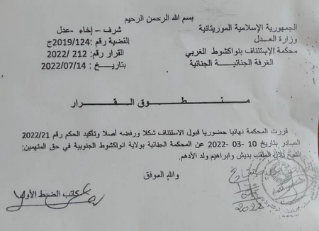 La chambre criminelle de la Cour d'Appel de Nouakchott-Ouest a confirmé jeudi 14 juillet la peine de mort contre deux inculpés dans le meurtre de Mohamedou Ould Berrou.