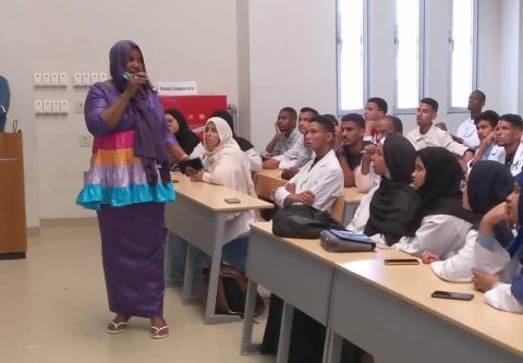 Devant un public d'étudiants, Mme Oumoukelzoum Sy, a fait une présentation détaillée sur l’importance du rôle du monde associatif et des relais communautaires dans la lutte contre la drépanocytose.